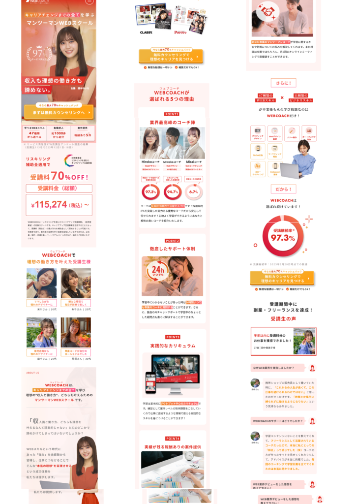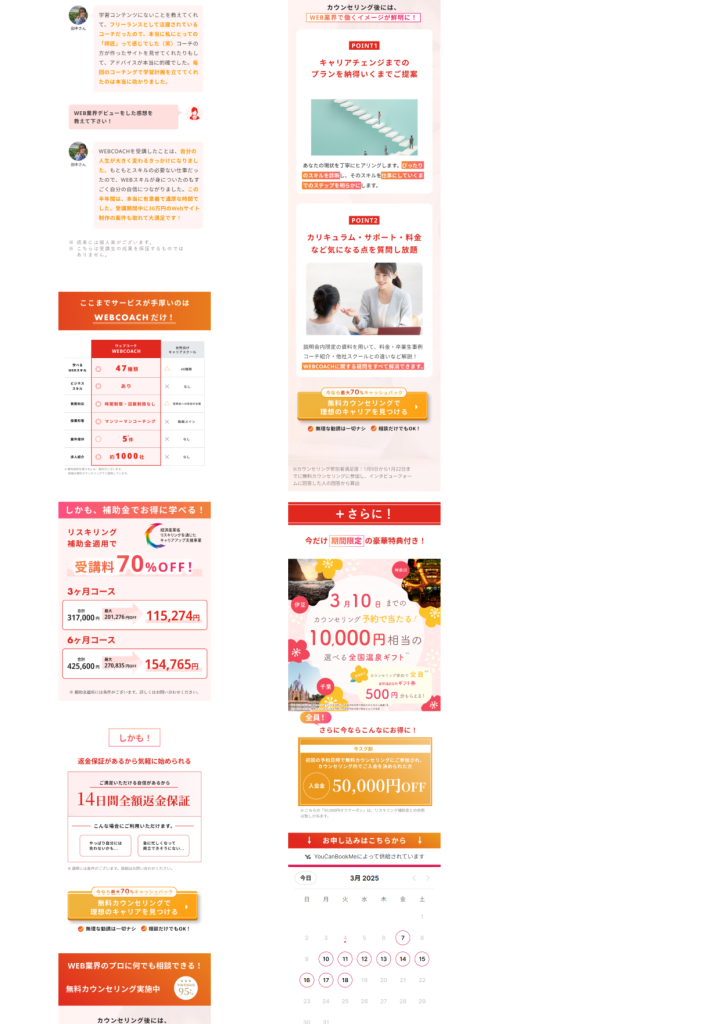 ランディングページ制作 2026年1月5日 最終更新日時 : 2026年1月5日 portfolio.shiraishi 【製作時間】20時間【使用ソフト】Photoshop・illustrator・Figma・HTML・CSS・jquery【担当業務】デザイン・実装【意識した亊】スクロール離脱を防ぐためjqueryで動きをつけたLPを作成しました。